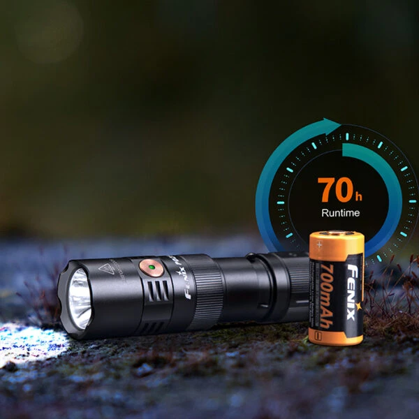 • battery level indicator on side switch glows for 3 seconds when light is switched on (works with Fenix 16340 battery only)