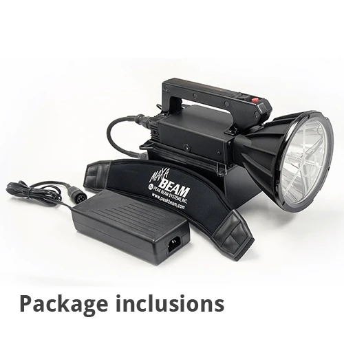 What’s included: MBS-410 12 Million CP Searchlight, MBA-8208-L 8 inch Power Coil Cord, MBP-1308 Lithium Iron Phosphate (LiFePO4) battery pack, MBA-6005 Battery Shoulder Strap, MBP-3205 AC Charger