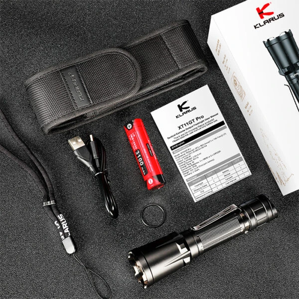 What’s included: Klarus XT11GT Pro flashlight, rechargeable battery, USB-C cable, pocket clip, nylon belt holster, wrist lanyard, and spare O-ring