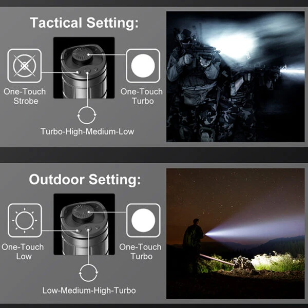 ☼ Low – 10 lumens, 120 hours, 20 meters